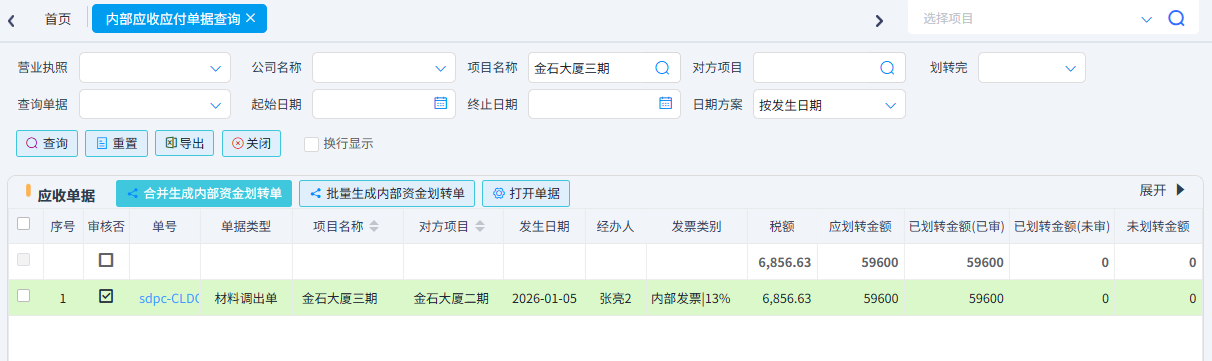 項目與項目或者公司總庫與項目之間調撥材料時由調出方填寫材料調出單,收入方填寫材料調入單,其中調入單必須根據材料調出單生成,調出單含稅金額會產生雙方的應收應付,后期可使用內部資金劃轉單進行資金支付。 材料調出單中發票類別選了帶稅率的類型,稅金也能調撥,為后續項目稅金月結單使用。