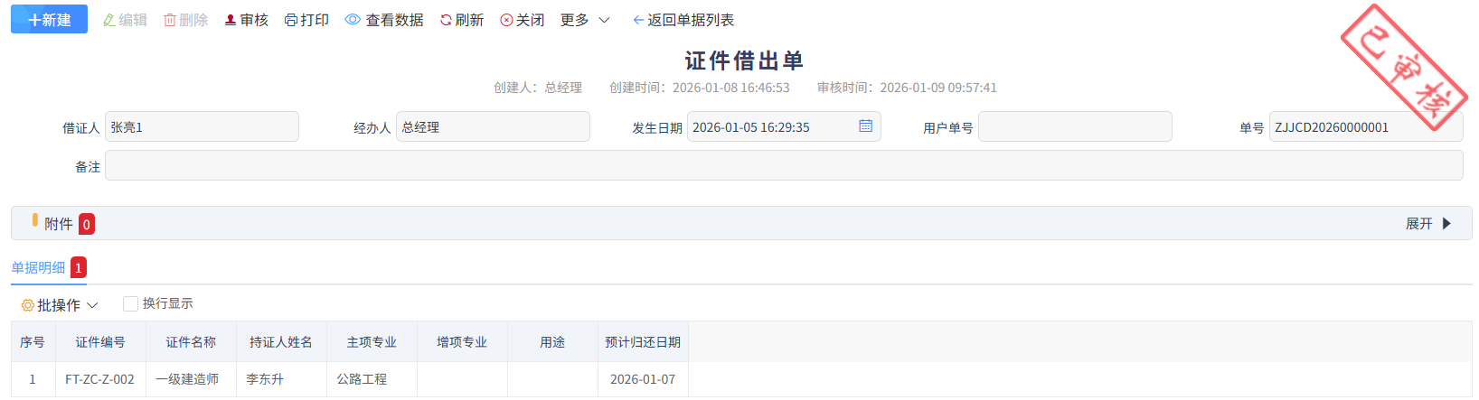 證件借出時,證件管理人員登記證件借出單,如下圖所示
