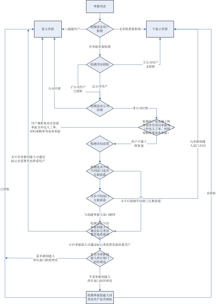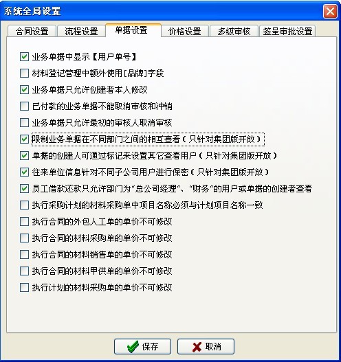 (3)材料采購單、材料銷售單、材料退貨單、外包人工單、外包機械單、運輸車輛單、租賃結算單、其它費用單、設備采購單、設備維修單、設備退貨單、付款申請單、付款單、收款單 (涉及財務的這14個單據) 對于【財務部】也不受該條件限制,可以查看所有部門單據。