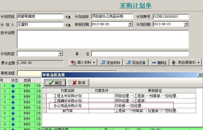 方案設(shè)置完成后,用戶在創(chuàng)建單據(jù)的時(shí)候根據(jù)不同的情況就可以選擇不同的方案,例如:如果公司行政部要采購(gòu)辦公用品,那么他們?cè)谧霾少?gòu)計(jì)劃單的時(shí)候,審核方案就可以選擇辦公用品方案。如下圖: