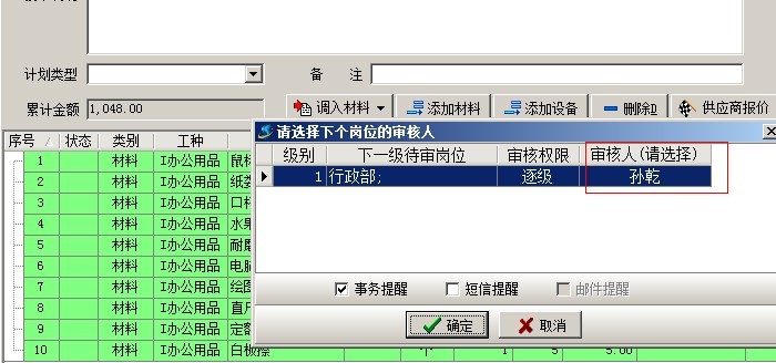 審核方案選好后,點(diǎn)保存按鈕保存單據(jù),這是會(huì)彈出待審人選擇窗口,如下圖,這時(shí)我們要選擇好下一級(jí)的審核人,選擇好后,那么該用戶就是業(yè)務(wù)單據(jù)的待審人。在審核中心和業(yè)務(wù)單據(jù)列表中就可以看到該業(yè)務(wù)單據(jù)。