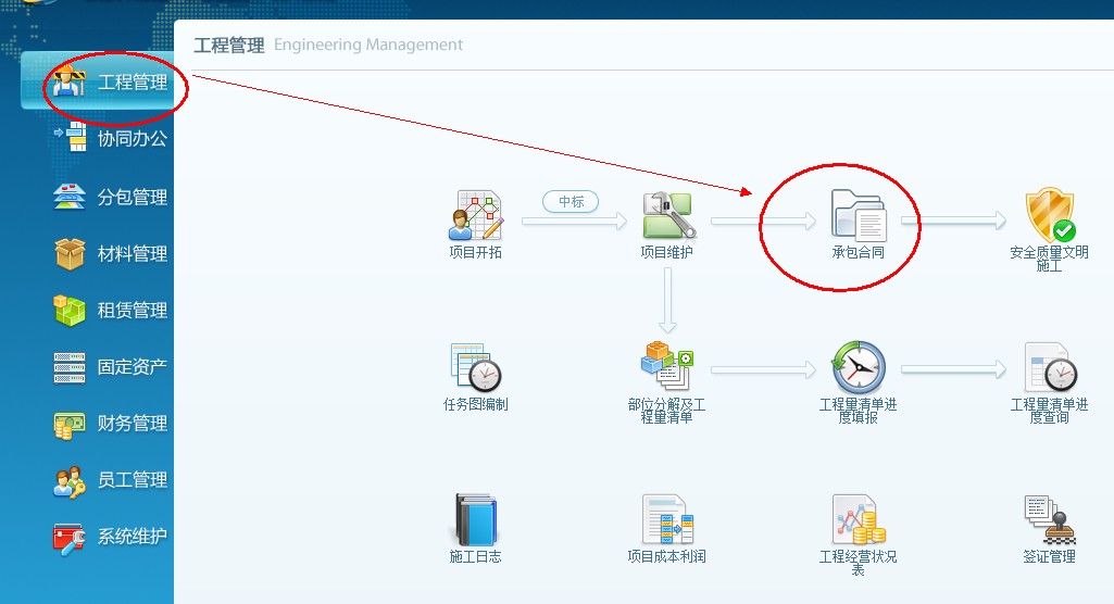 3、如果是項(xiàng)目中標(biāo), 項(xiàng)目新建之后,接著建立承包合同,打開(kāi)工程管理,點(diǎn)擊承包合同