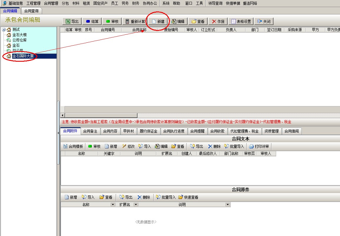 左邊選中新建的項(xiàng)目名稱金石國(guó)際大廈,右邊點(diǎn)擊新建,彈出新建承包合同窗口,錄入合同基本信息,填寫合同履約保證金金額,然后保存。